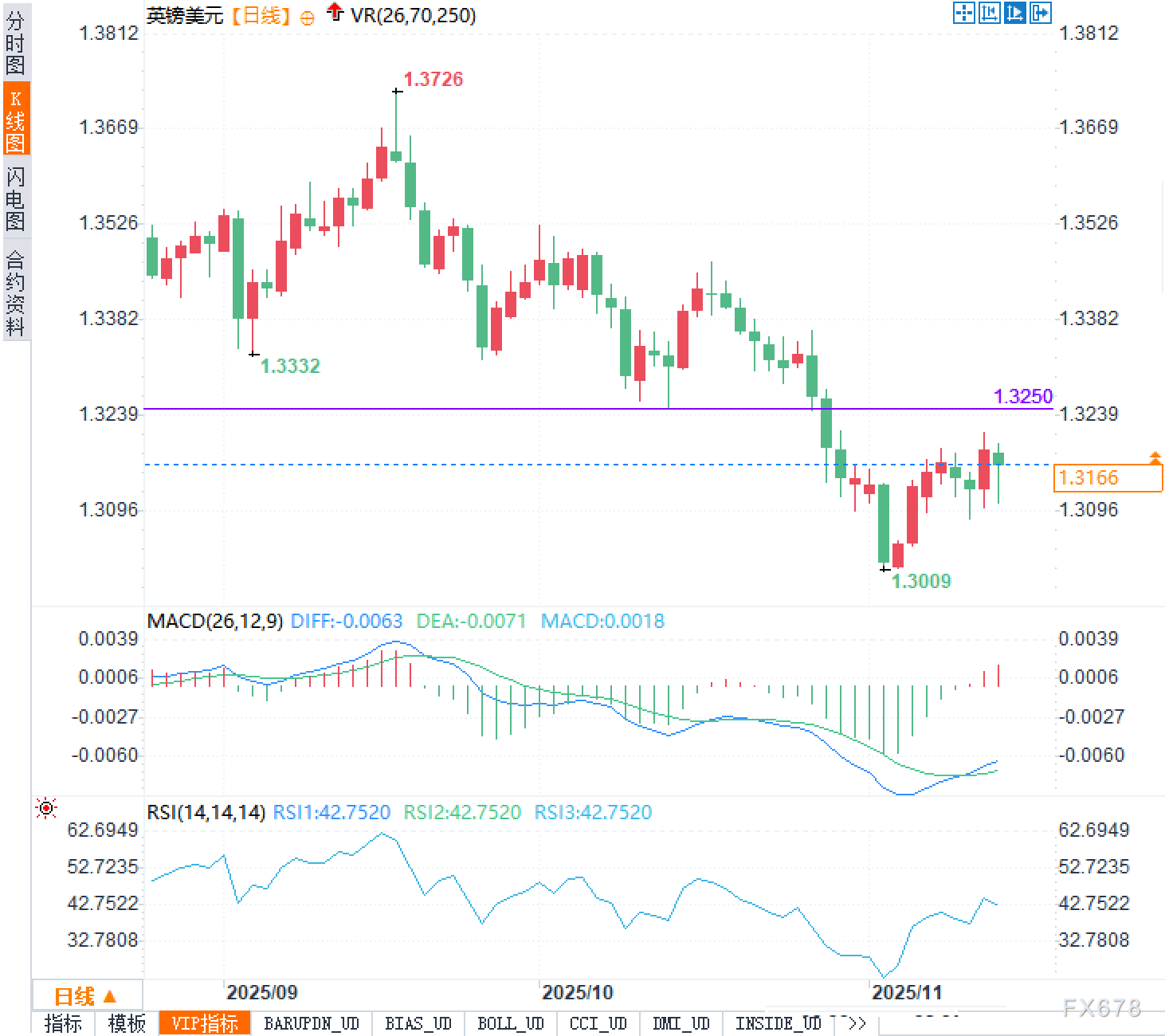 RSI指标目前维持在42附近,反映出英镑处于中性区域,市场情绪没有明显偏向多头或空头。RSI在42附近的震荡状态也暗示着汇价可能进入短期的盘整期,短线涨跌幅度可能有限。