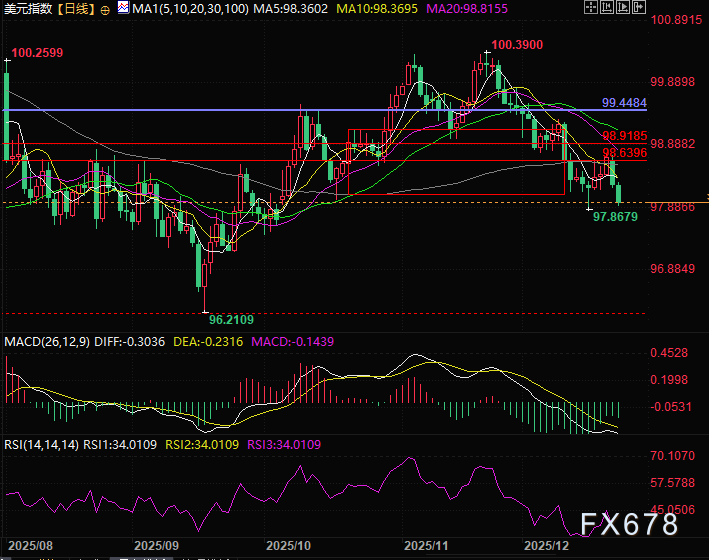 汇通财经APP讯——周二(12月23日)欧洲早盘交易时段,衡量美元兑六大主流货币表现的美元指数(DXY)延续弱势节奏,盘中一度触及97.91附近的月度低点,这一走势充分反映出,市场对美联储在近期降息后延续宽松周期的押注正在不断升温。
